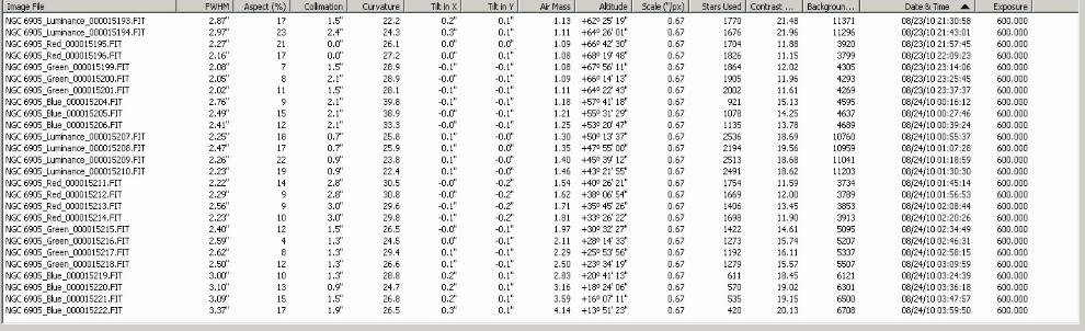 CCDInspector analysis of the subframes. Note that to get a quick look at what images I could get with this new scope I ran all night and the last subs were
