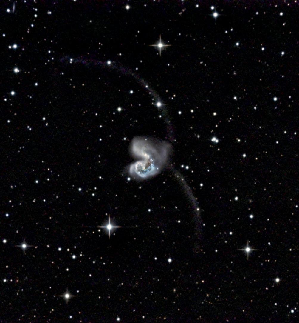 | Vixen VMC260L, STL11K 2 hours L, 1.5 hours R, 1.9 hours G, 2.6 hours B (Total time about 8 hours) March 2010 CCDCommander, MaximDL, CCDStack, Photoshop CS4 The two galaxies, NGC4038 and 4039, are undergoing a glancing collision. As they swing past each other long tidal tails of stars are torn from each. Our galaxy and M31 will undergo a similar interaction in 3 billion years or so |