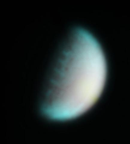| Celestron C14, Televue 2.5x Powermate, PGR Flea3 FL ~ 9.8 m Astrodon UV, Astronomiks G, IR Taken at Dusk local time with Venus at Alt 40 deg Firecapture for camera control AVIStack2 for stacking Registax6 for wavelets Click on image for JPG |