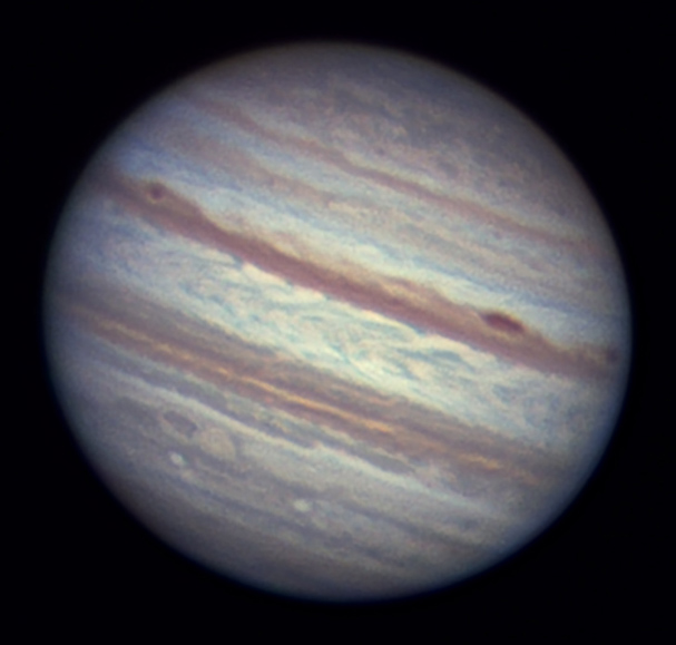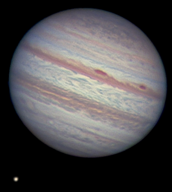 | Jupiter and Callisto 0437H UTC NIR, R, G, Hb, B filters Color: Red from 0.5 NIR+R, Green from G, Blue from HBeta+B Luminance from 0.5 NIR + the color image as above |