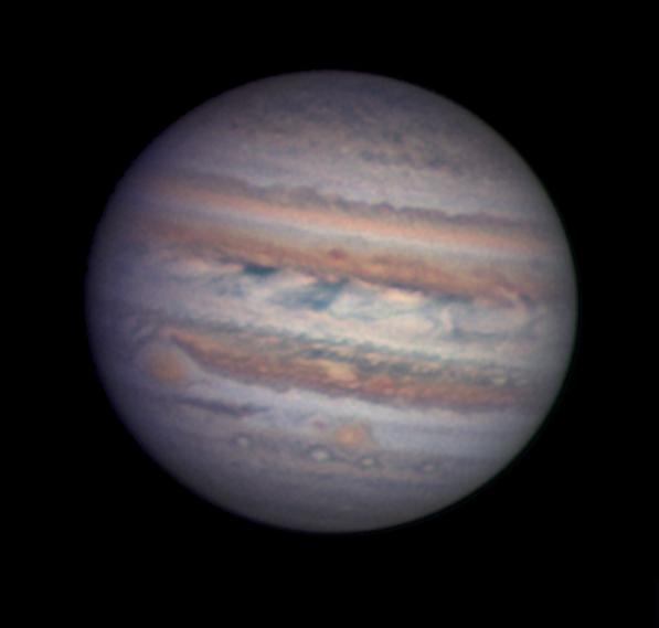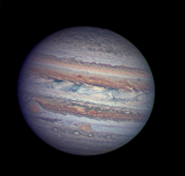 | Astronomik IR,R,G,B filters, 3000 frames each ~10 mS/frame, best 1000 stacked AVIStack2, Registax, WinJuPos, Photoshop A night of superb seeing! A less agressivley processed image from the same night (less sharpening and less use of the IR data in the luminance channel) is below: |