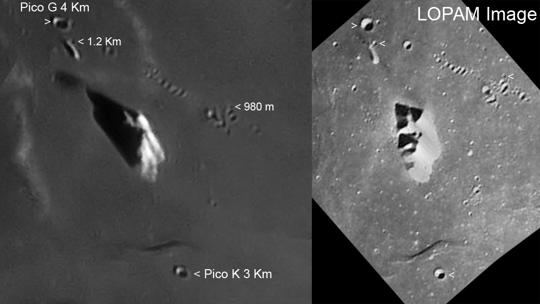 | Detail of Mons Pico region (at 7 o'clock from Plato) Craters down to about 1000 meters diameter are visible(Dawes limit for 250mm aperture is 880 m for the moon that night) . The LOPAM image confirms there are craters here, not just noise (Note the projection and orientation of the LOPAM image is very different) |