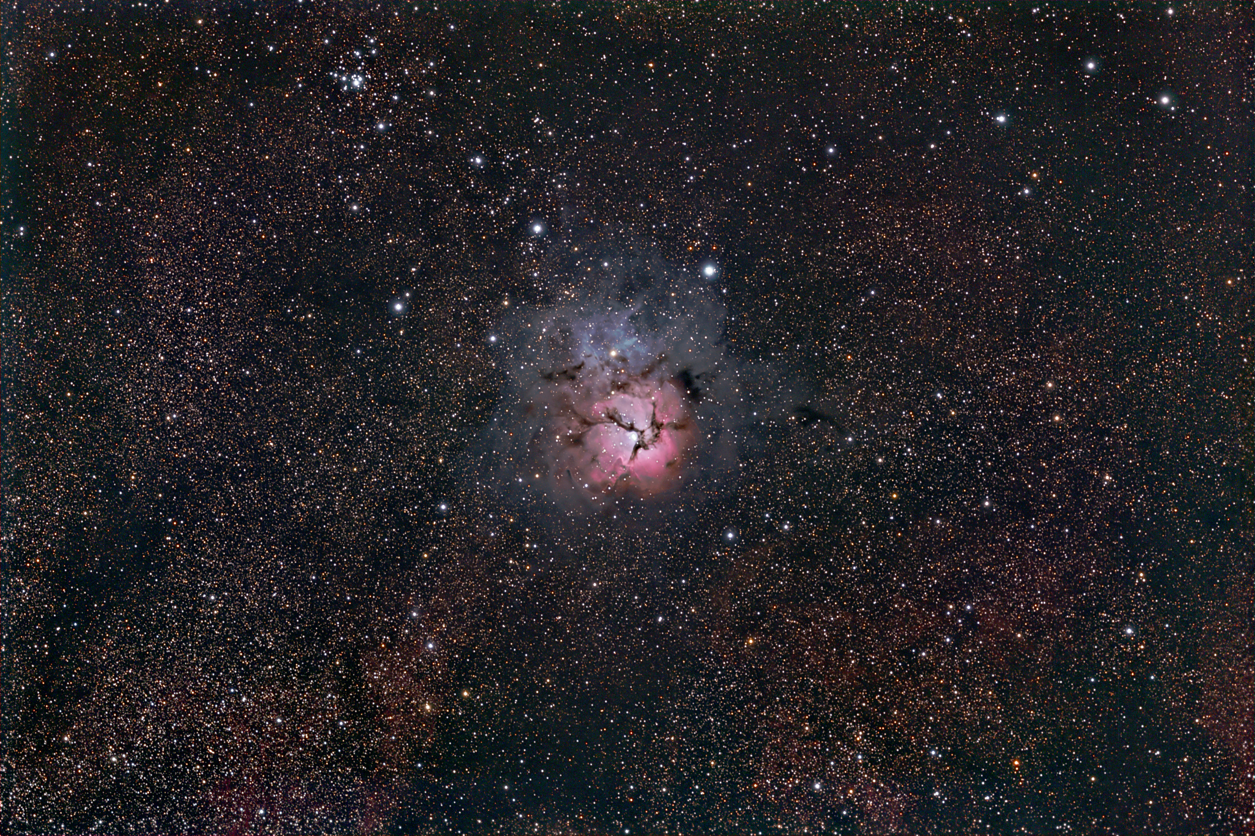 | Tak TOA-150, 67 Flattener ST11K, Astrodon LRGB Filters AP1200 Mount CCDStack, CCDIS and Photoshop 84 min L, 50 min R, 55 min G, 55 min B July 26 and 27 2008 Subs acquired at Alt between 23d and 29d 42m (as high as M20 gets 'round here) Thanks to Jim Solomon and Ray Gralak for suggestions and advice Click on image for full (6+Mb) size |