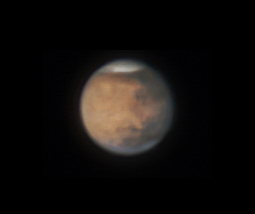| Mars New Years Day (actually 1022h UTC January 2 2010) TEC 250 f20 + 2x Powermate (final focal length 10 meters). Skynyx 2-1 color camera. Image scale 96 mArcSec/pixel 1000 frame AVI captured with Lucam Recorder, Stacked with AVI Stack, wavelet sharpening with Registax final processing with Photoshop CS2 As on Christmas night, New Years Night provided a brief window of clear skies. As Mars transited a light haze picked up and the seeing became very good. Shortly after transit the cloud cover became solid. See image below to orient to some features (Xanthe and Valles Marineris) relative to a Hubble image of Mars taken at the 1995 opposition. Note the Hubble image is taken at a slightly different rotation of the planet. |