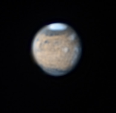 | FireCapture for Capture AVIStack2 and Registax6 for processing Apparent Diameter 10.14 Arc Sec 93% Illuminated Mouseover for labels The labeled gray-white areas labeled as "Mountains" (Olympus Mons, Alba Mons and the three peaks of the Tharsis Montes) are not the mountains themselves but orographic clouds forming on the sides of those mountains. "Orographic" (from the Greek Oro (hill) and graph (write) ) clouds form when winds encounter a mountain and are forced upwards, Surprisingly the atmosphere of Mars can be supersaturated with water and as the air rises the air pressure decreases and the air cools, water vapor in the air condenses. Because of the very low pressure the vapor condenses not as water droplets but as ice crystals. See http://cd.textfiles.com/suzybatari2/nasa/mars_c/mc8.txt The mountains on which the clouds are forming are high - 7 to 22 Km above the mean Marian surface. Mt Everest by comparison is about 9 Km above sea level) Thanks to the educated, helpful people on the Yahoo SCT group for directing me to information about the Martian orographic clouds. |