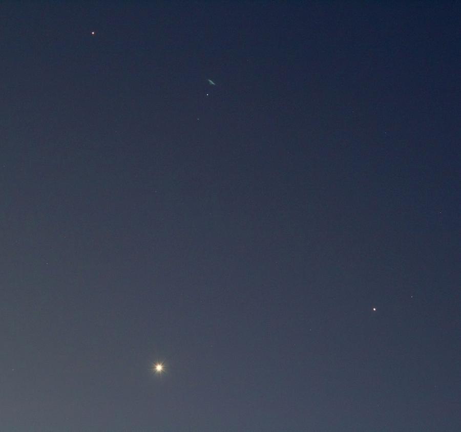 | Canon EOS, 150mm lens Single 3 sec exposure At 9 PM PDT 8 August 2010, Venus Mars and Saturn were all within about 6 degrees of each other. The linear smudge is a passing cloud. Mouseover for labels |