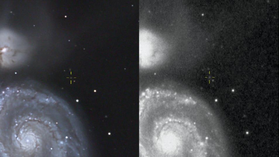 and on the finder image from the Palomar 48" Schmidt (right). SDSS J132940 is relatively bright galaxy at Mag 20.5 but is quite distant with z =
